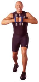 The BEST Aerobic Exercise We have discovered Heavy Hands Walking , originally designed by Dr Leonard Schwartz MD, is the most efficient and effective exercise system for maximum energy, fat burning, cardiovascular fitness, and lean muscle enhancement. It is easy and practical and is appropriate for any age and any fitness levels. Dr Schwartz had been a non-athlete all his life. In fact, he was sedentary. He smoked and was overweight. In his fifties, he decided he needed to do something about the shape he was in. Today, Dr Leonard Schwartz is 76 years of age, 2% body fat with a resting heart rate of 32. He achieved this extraordinary state of health walking 30 minutes a day with Heavy Hands. What is Heavy Hands Walking? Heavy Hands Walking involves walking at a comfortable steady pace (approximately 3.0-3.5 miles per hour), pumping light hand weights. While walking you perform three different exercises with your hand weights (Chest Flyes, Lateral Raises, and Overhead Presses—for shorthand purposes, referred to as “F.L.O.”). You pump and walk to warm up and in between each set of the three exercises. What are the benefits? When you walk, you use only about 40% of your lean body mass (i.e. your muscles). Even when you run, you don't use much more (you just use the muscles you are already using a little harder). But with Heavy Hands walking, you are able to engage nearly 80% of your lean body mass. With so many muscles working, there is a tremendous amount of blood and oxygen demand being created. This stimulates your whole cardio-respiratory system (your heart, lungs, and blood vessels) to improve. Your resting heart rate will lower to reflect your strong heart and you'll have more energy all the time. Your stronger heart and more efficient lungs will be able to deliver more oxygen to your body and brain. More oxygen means more energy. Because you are working out in your aerobic zone, Heavy Hands walking is also an excellent way to reduce body fat. It is also a great way to tone and strengthen your whole body. Since you are using over 80% of your lean body mass, you are stimulating growth and improvement in most of your body. You will develop muscular endurance and tone. You will feel stronger and look firmer. Recommended Duration and frequency For maximum fat burning results, we recommend walking with Heavy Hands for a minimum of 30 minutes, at least 3 times every week. If you want to burn more fat, walk for longer periods (45 minutes to 1 hour), and more often (5-7 times a week). How do you progress? There are two variables: repetitions and weight . Weight: Both men and women start with 1-pound hand weights. This may seem light at first, but it is for good reason. You need to strengthen your connective tissues with a light weight to avoid injury when you progress to heavier weights. The goal for women is to progress to 4-5 pound hand weights (within 6 months), and for men, 6-8 pound hand weights (within 9-12 months) using the progression below. Repetitions: Increase your repetitions of each of the F. L. O. exercises every week over a six-week period (up to 6-pound weights). Then, at the end of 6 weeks, increase your hand weights by 1 pound, if you are comfortable doing so. Progression for repetitions : Week 1: 25 repetitions Week 2: 30 repetitions Week 3: 35 repetitions Week 4: 40 repetitions Week 5: 45 repetitions Week 6: 50 repetitions When you progress to 6 pound weights and over, increase your weight by one pound only after 12-weeks i.e. do 2 weeks of 25 reps, 2 weeks of 30 reps, 2 weeks of 40 reps, 2 weeks of 45 reps and 2 weeks of 50 reps before you increase your weight again. Only increase in weight when it feels comfortable for you. Listen to your body. Where can you do Heavy Hands? You can walk with Heavy Hands in the gym on a treadmill, on the spot or outside. If you use a treadmill, set the incline at 5.0 (to take the pressure off your knees) and set the speed at 3.0-3.5. Keep the speed constant unless you exceed 75% of your MHR (in which case slow the speed a little). If you have difficulty walking, you can just do the upper body movements standing still or walking on the spot, and you will still get significant aerobic benefit. Monitor your Heart Rate You burn the most fat when exercising aerobically. Your body is in an aerobic state when exercising between 60% and 75% of your Maximum Heart Rate. When you exceed your upper limit, you enter the anaerobic zone, where you burn little fat, and mainly protein and carbohydrates. Your Maximum Heart Rate = 220 and minus your age. So if you are 45, your maximum heart rate is 175. Your aerobic fat burning range then is calculated as: Lower Limit: 175 X .60 = 105. Your Upper Limit is: 175 X .75 = 131.25. When walking with Heavy Hands, to burn the most fat, keep your heart rate between 105 and 131.25. If you start exceeding the upper limit consistently throughout your walk, decrease the speed at which you are walking. Do not stop performing the upper body exercises. Note that when you do the overhead presses, your heart rate may go above your upper limit, but as long as your heart rate stays in the fat burning range most of the time, you do not need to slow down your pace. To monitor your heart rate, you can wear a heart rate monitor. You can buy one from any good sports store. Polar is a good brand. You can enter in your upper and lower limits, and an alarm will sound when your heart rate exceeds your upper limit. How do you do Heavy Hands? Below are some graphics illustrating how to perform these exercises with hand weights. “Pump & Walk” This is the basic movement. Pump and walk to warm up for 1 or 2 minutes before doing your F. L. and O. exercises, and as the rest break between the F. L. and O. exercises. You do one pump per step and stay in rhythm. This means that every time your right hand comes up, your left foot is coming off the ground. The actual arm movement is a curl, like a bicep curl, except you turn your wrist a 