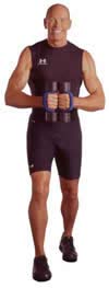 After warming up with “pumping and walking,” perform one set of Chest Flyes. As you're walking, bring your Heavy Hands up to chest height with your knuckles facing each other. Then, keeping your elbows locked at a 90-degree angle, bring your elbows back as though you're trying to touch your elbows behind your back. Don't force it. Just do a range of motion that is comfortable for you. Listen to your body. Again, it's one pump per step. As your elbows come back, your left foot hits the ground. As your hands come back together, your right foot hits the ground. So it's left, right, left, right. One pump per step. After finishing your set of chest flyes, pump and walk for about a minute. |